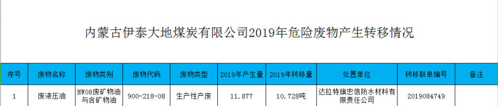 内蒙古伊泰大地煤炭有限公司2019年危险废物产生转移情况 <span>发布时间:2020-08-06</span> | <span class="views">关注:<b id="viewCountId">4147</b></span> | <a href="javascript:void(0)" class="print"><i class="ion"></i></a> 大地精煤矿2019年危废转移联单.pdf 返回列表 上一条 下一条