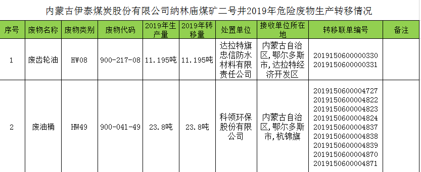 内蒙古伊泰煤炭股份有限公司纳林庙煤矿二号井2019年危险废物生产转移情况 <span>发布时间:2020-09-03</span> | <span class="views">关注:<b id="viewCountId">8463</b></span> | <a href="javascript:void(0)" class="print"><i class="ion"></i></a> 转移联单_2019150600000331.pdf转移联单_2019150600004727.pdf转移联单_2019150600000330.pdf转移联单_2019150600004822.pdf转移联单_2019150600004823.pdf转移联单_2019150600004824.pdf转移联单_2019150600004837.pdf转移联单_2019150600004839.pdf转移联单_2019150600004838.pdf转移联单_2019150600004870.pdf转移联单_2019150600004871.pdf 返回列表 上一条 下一条