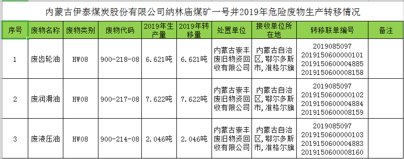 内蒙古伊泰煤炭股份有限公司纳林庙煤矿一号井2019年危险废物生产转移情况 <span>发布时间:2020-09-03</span> | <span class="views">关注:<b id="viewCountId">9896</b></span> | <a href="javascript:void(0)" class="print"><i class="ion"></i></a> 转移联单_2019150600000102.pdf转移联单_2019150600000101.pdf转移联单_2019150600000103.pdf转移联单_2019150600004883.pdf转移联单_2019150600004884.pdf转移联单_2019150600004885.pdf转移联单_2019150600008158.pdf转移联单_2019150600008159.pdf转移联单_2019150600008160.pdf转移联单_2019085097.jpg 返回列表 上一条 下一条