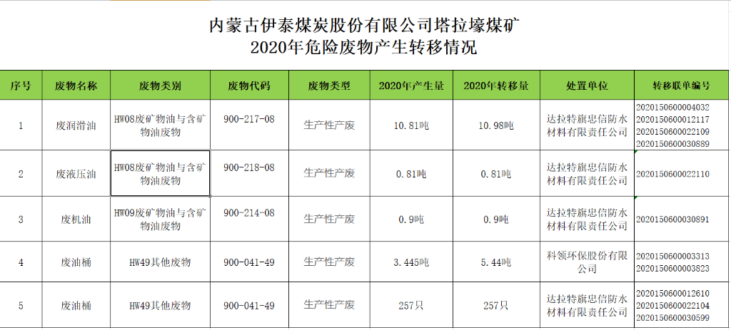 伊泰塔拉壕煤矿2020年危险废物产生情况 <span>发布时间:2021-07-22</span> | <span class="views">关注:<b id="viewCountId">3800</b></span> | <a href="javascript:void(0)" class="print"><i class="ion"></i></a> 转移联单_2020150600003823.pdf 转移联单_2020150600003313.pdf 转移联单_2020150600004032 .pdf 转移联单_2020150600012117.pdf 转移联单_2020150600012610.pdf 转移联单_2020150600022104.pdf 转移联单_2020150600022109.pdf 转移联单_2020150600022110.pdf 转移联单_2020150600030599.pdf 转移联单_2020150600030889.pdf 转移联单_2020150600030891.pdf 返回列表 上一条 下一条